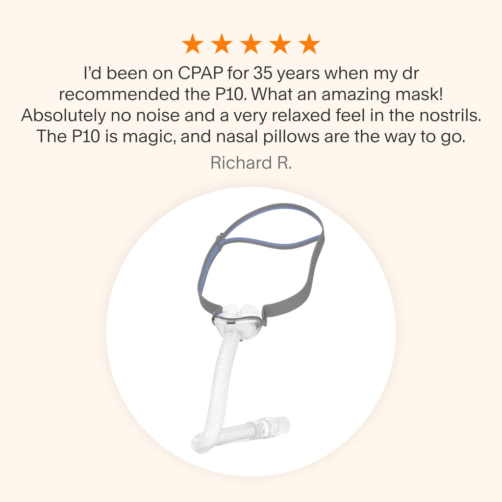 We've paired the AirFit P10 with the AirMini because it is one of the most compact masks on the market, making it the ultimate CPAP mask for travelers. The P10 offers a secure seal for all sleeping styles, plus a small facial footprint that won't leave your face covered in red marks when you're posing for all those vacation photos.