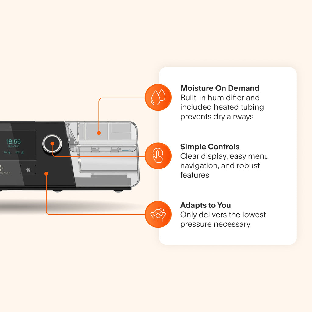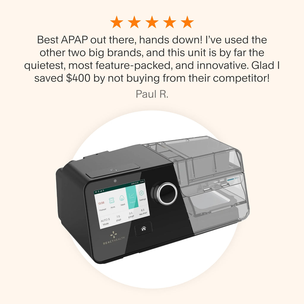 The Luna G3 Auto from React Health (formerly 3B Medical) prioritizes comfort and efficiency—as evidenced by its included heated tubing, PM2.5 air filter, auto-ramp functionality, and accessory and supply reminders. This auto-adjusting positive airway pressure (APAP) device intuitively changes your pressure settings as needed, so you can get a good night’s sleep no matter your pressure needs.