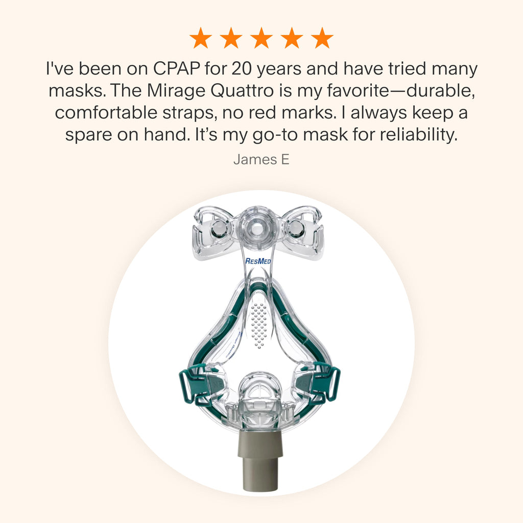 If you need a dependable full face seal without over‑tightening, the ResMed Mirage Quattro Full Face CPAP Mask brings adjustable stability to nightly therapy. Its dual‑wall cushion with Spring Air support adapts to your contours while the forehead pad and MicroFit Dial help you lock in comfort for quieter, steadier sleep.