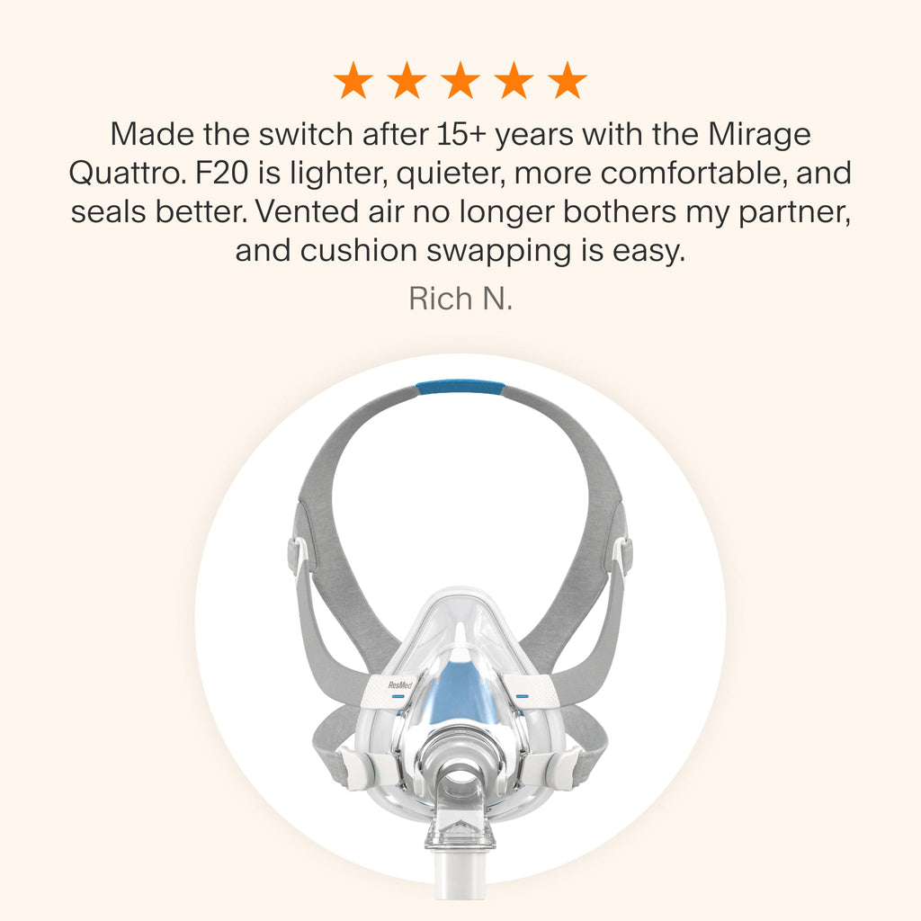 Settle into dependable therapy from the first night. The ResMed AirSense 10 AutoSet with AirFit F20 Full Face Mask Bundle combines automatic pressure support, integrated humidification, and a supportive full-face seal to keep your treatment consistent and comfortable.