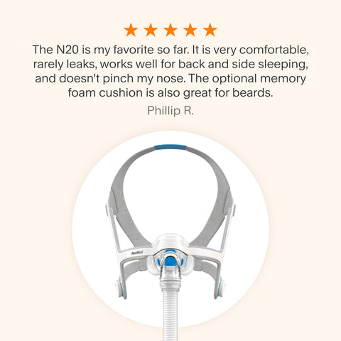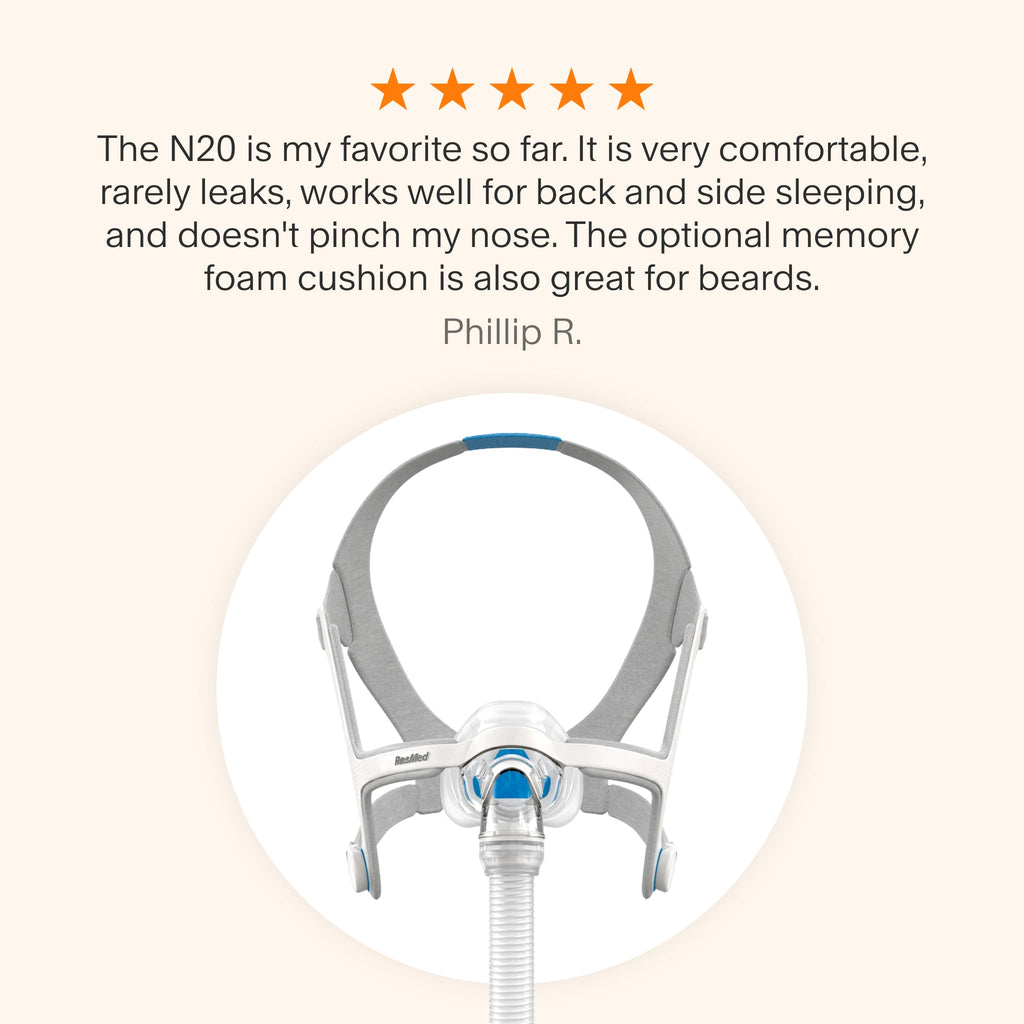 Struggling with mask leaks, red marks, or a bulky fit? The ResMed AirFit N20 Nasal CPAP Mask pairs a flexible frame with the InfinitySeal cushion to adapt to your face and maintain a steady seal. A clear field of view and QuietAir venting help you settle in and sleep without distraction.