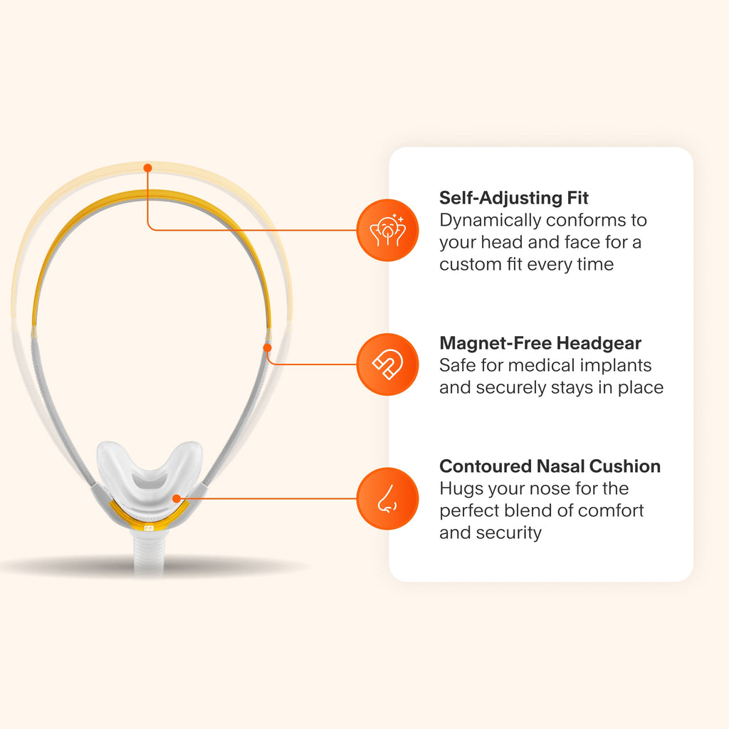 The Solo pairs a low‑profile nasal cradle cushion with AutoLock headgear designed to hold your seal as you move and as pressure changes. The result is simpler setup, fewer pressure points, and a quieter bedtime routine. Set it once, then forget it while you sleep.